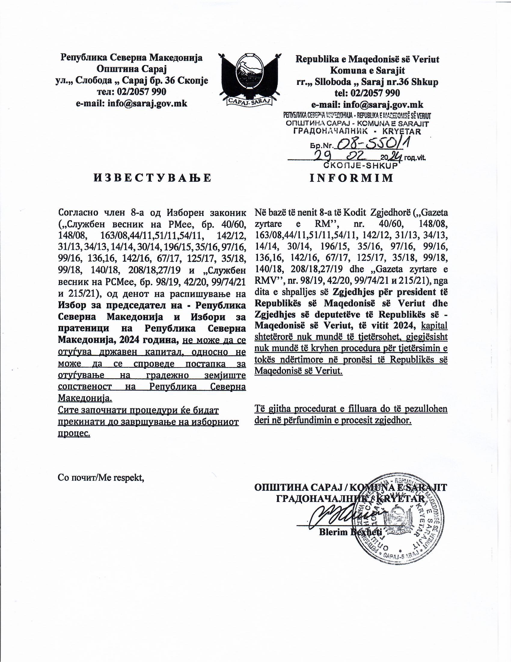 Процедура за внатрешна комуникација во Општина Сарај