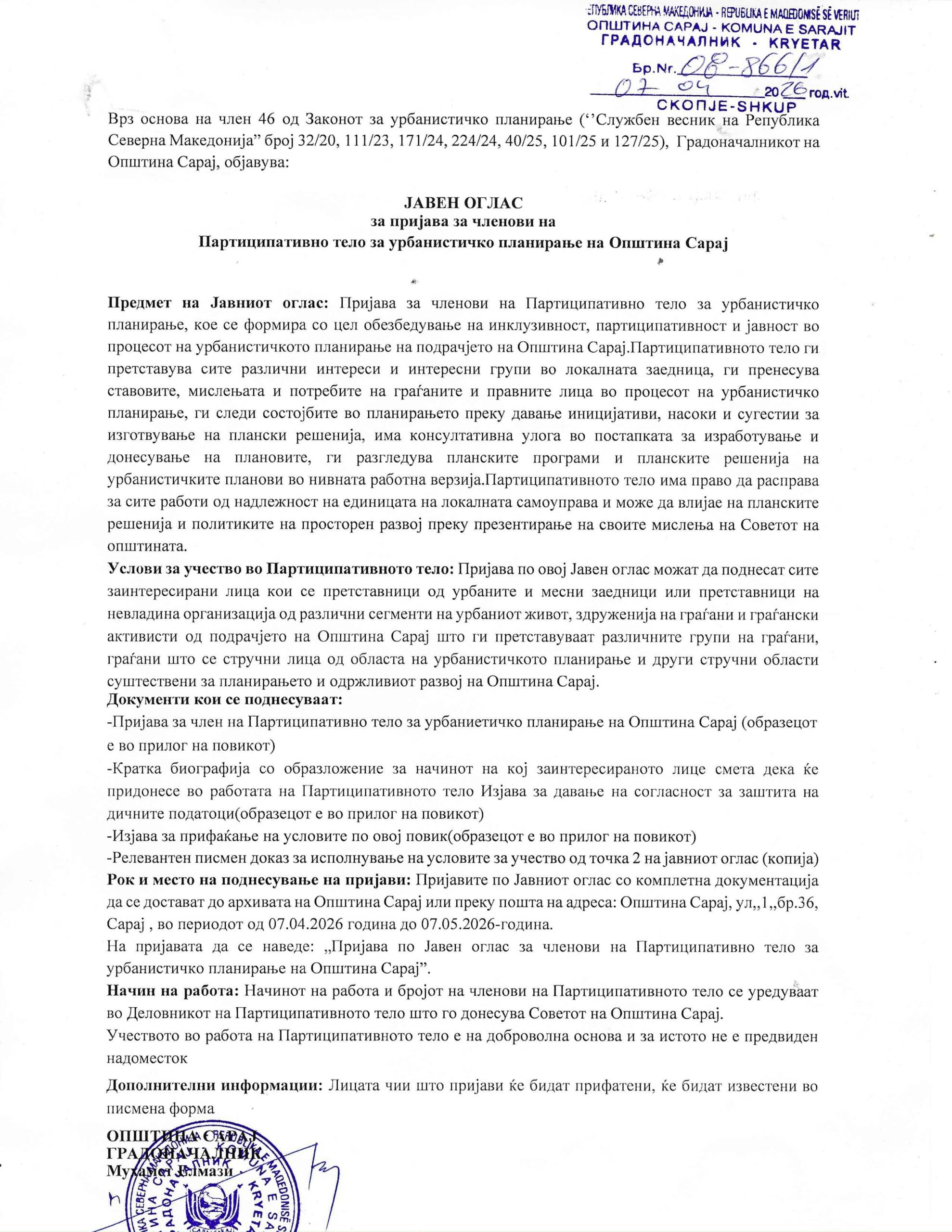 Јавен оглас за пријава за членови на Партиципативно тело за урбанистичко планирање на Општина Сарај 2 days ago by sadmin 0 Апликативен ФормуларФормулар за Услови