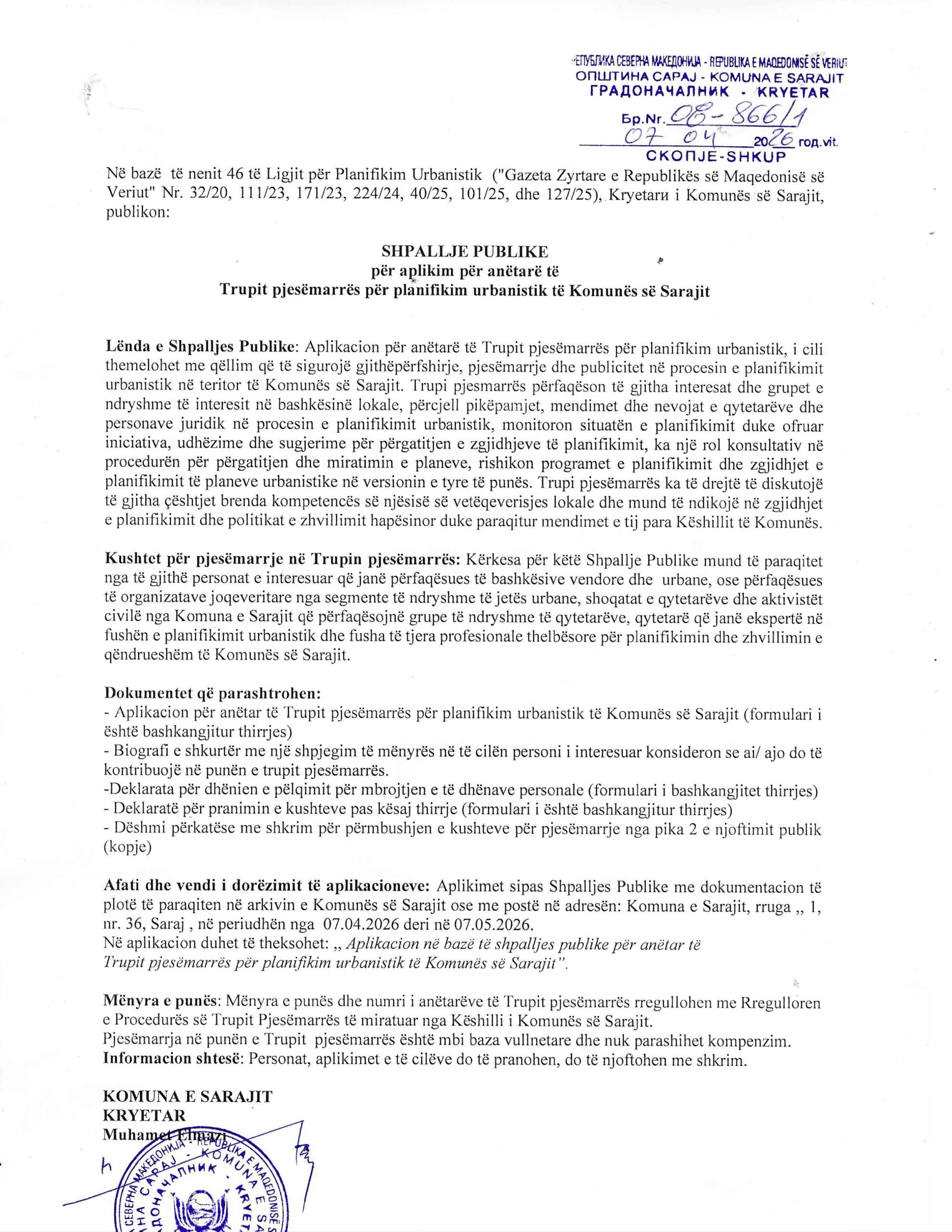 Shpallje publike për aplikim për anëtarë të trupit pjesëmarrës për planifikim urbanistik të Komunës së Sarajit 2 days ago by sadmin 0 Formulari AplikativFormular për pranimin e kushteve